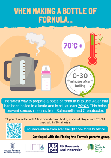 The safest way to prepare a bottle of formula is to use water that has been boiled in a kettle and is at least 70°C. This helps prevent serious illnesses from Salmonella and Cronobacter. If you fill a kettle with 1 litre of water and boil it, it should stay above 70°C if used within 30 minutes.