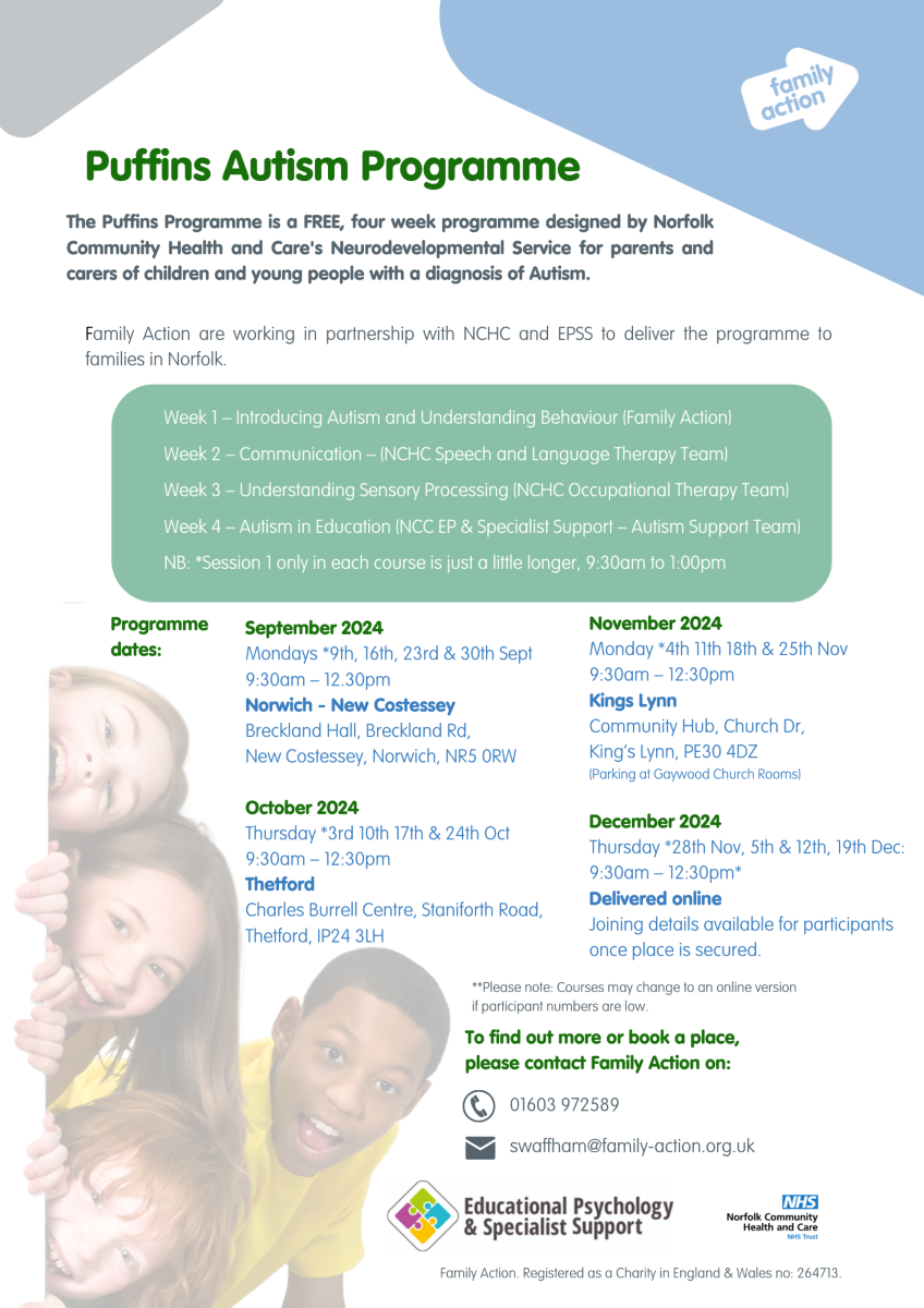 NDS clinicians also support the delivery of 'Puffins', a 4-week information group coordinated by Family Action and designed for caregivers of autistic children and young people. Read more about Puffins Autism Programme.